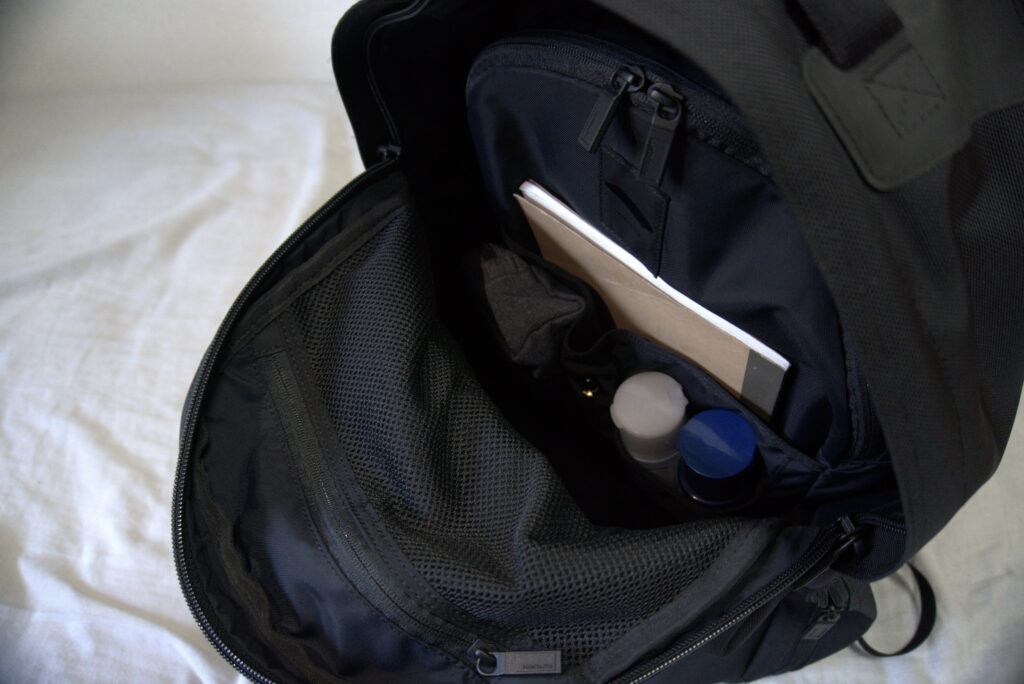 中の収納はこのように数が多いわりにポケット一つ一つが大きいため、小物や衣服を好きに仕分けられて自分使いがしやすい仕組みになっています。どこに何を入れたのかを分かりやすくできるのはありがたい内装です。