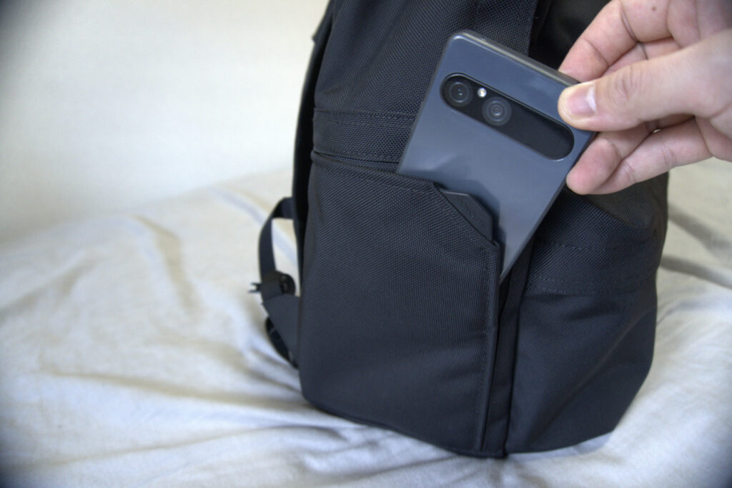 サイドにはマグネットポケットが採用されており、スマホをスマートに収納できます。