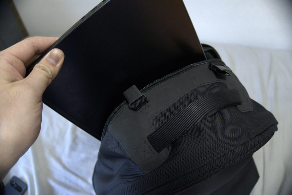 ノートパソコンを入れられるクッション付きのポケットが背面部分に外付けされているためスムーズに出し入れすることができ、縦入れのためパソコンが零れ落ちる心配がないことで落として破損するリスクも防げます。出かけ先でも編集やデータ整理をする人にも使いやすいです。